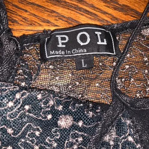 Stylish black top with intricate lace/embroidery sheer mesh panels. The back is open with a tie at t... Show more