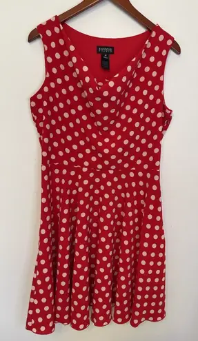 Enfocus Studio Women's Fit & Flare Polka Dot Dress is a knee-length dress made of a polyester blend material. It features a cowl neck and sleeveless design with a pullover closure and a zipper on the side. The dress is red and white in color and has a polka dot pattern.