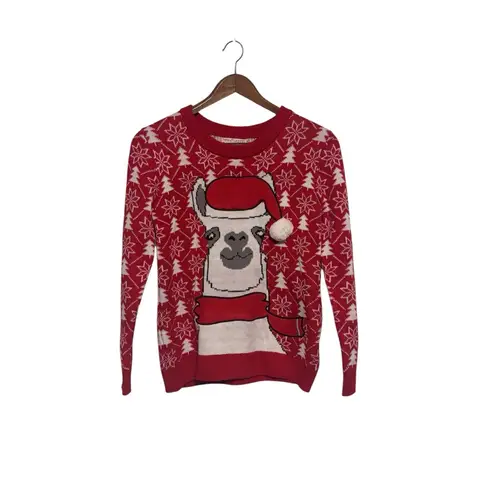 - Festive red sweater with a llama wearing a pom pom beanie hat, scarf, and snowflake and Christmas... Show more