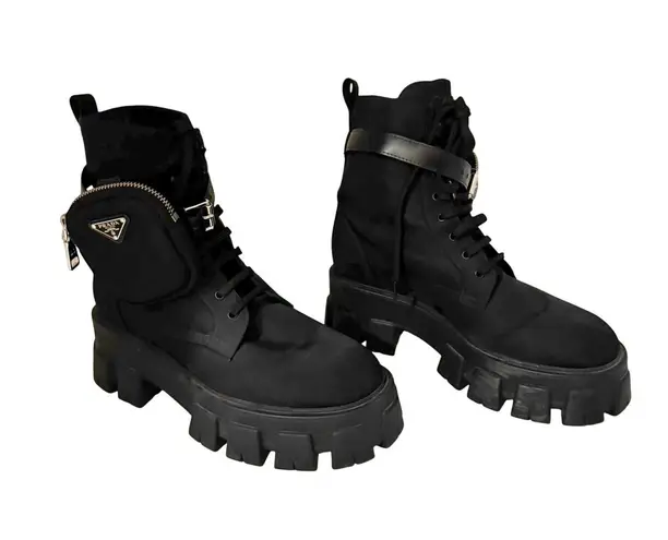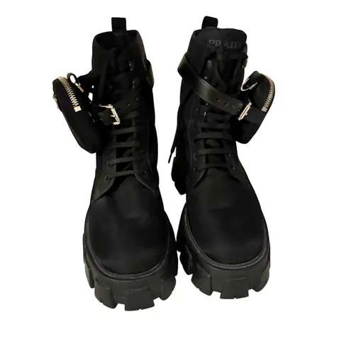 These iconic Prada Monolith combat boots bring together the brand’s signature Re-Nylon, sculptural s... Show more