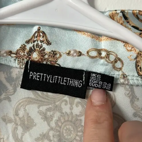Brand: Pretty Little Thing Style: Chain & Leopard Print Satin Blazer Color: Light Blue with Gold/Bro... Show more