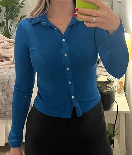 Flattering, versatile button up long sleeve top. Looks good buttoned and unbuttoned. The blue has a... Show more