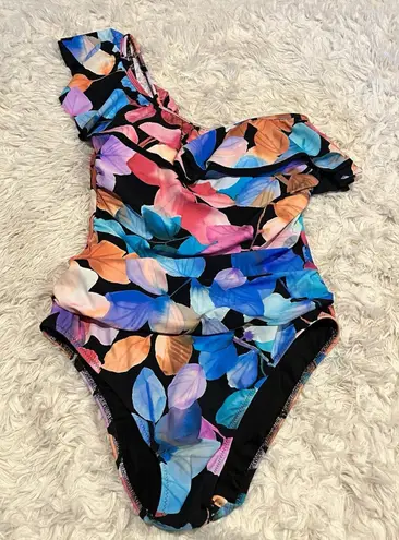 The Profile By Gottex Ruffle One Shoulder One Piece Swimsuit in Color Rush Black is a stylish and flattering swimwear option for women. This one-piece suit features a floral pattern with ruffle accents, offering a trendy and colorful design. Made from polyamide, it provides a comfortable and stretchy fit with tummy control features. The ruffle shoulder adds a touch of elegance, making it a perfect choice for those looking for a chic and comfortable swimwear option. Smoke free and pet friendly home. With shipments going out every other business day, you can expect your product to arrive in no time. Thanks for shopping by!
