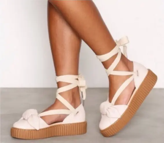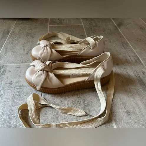 Leather upper with rubber sole Laced front with wrap tie closure Front bow accent Platform height 1.... Show more