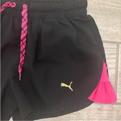 Lightweight and stylish Puma women's running/training shorts in black with bright pink ruffle side p... Show more