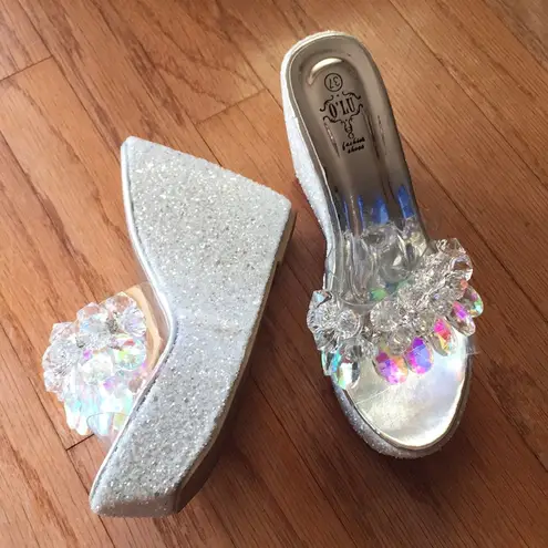 Worn once for 20 min. In like new condition. No flaw at all. Clear pvc upper with CZ and plastic studs. So stunning and comfortable. Very light. Easy to walk. Glittery silver wedge. 4” heels. 2” platform. Medium width. True to size 7. Make legs look longer and slimmer. No trades.