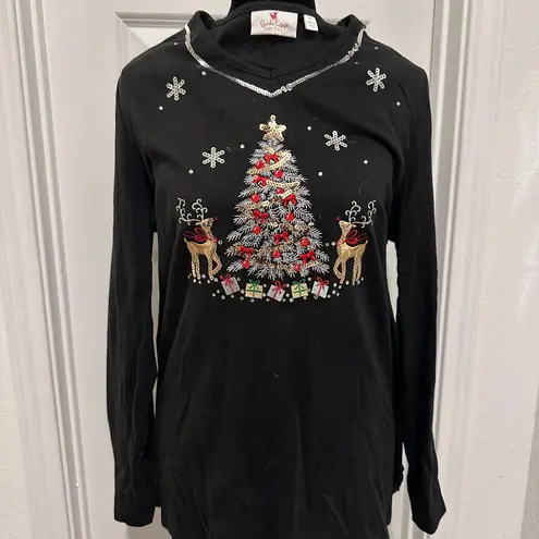 , size XL. This festive long-sleeve top features an intricately embellished Christmas tree design with rhinestones and sequins. Gold reindeer and snowflake accents complete the holiday look. Designed for comfort and style festive holiday gatherings! This top is in excellent pre-owned condition, perfect for adding some sparkle to your holiday wardrobe.
