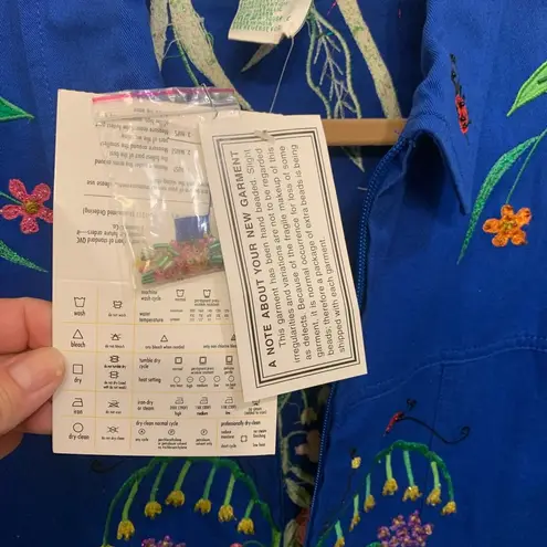 Vintage NWT Quaker Factory 100% Cotton Jacket/Blazer. Royal blue in color with colorful floral ladybug , bees, and green grass. Embellished with beads. Front zipper closure, dual pockets. New with tags come with extra beads. Size: Large Measurements: 25” armpit-armpit 18” armpit-hem 24.5” sleeve Vibrant blue jacket featuring colorful floral embroidery. Perfect for adding a pop of color to any outfit.