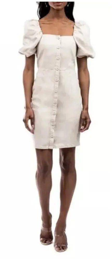 RACHEL PARCELL Square Neck Puff Sleeve Minidress COLOR: Beige Size: Medium Approximate measurements laying flat: Center to hem length 30" Bust 17" across Beige Mini Length Puff Sleeves Lined Main body: 55% Linen, 43% Viscose, 2% Spandex Condition: New without tags