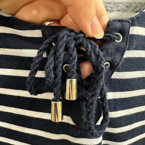 Rafaella brand 3/4 sleeve top. Navy & white thin horizontal stripes. Round neckline that laces up wi... Show more