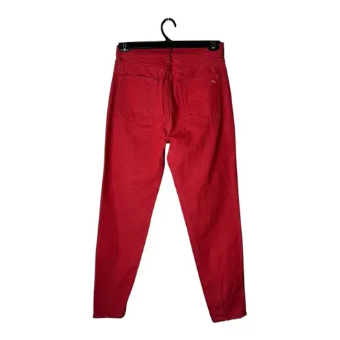 These high-waisted jeans offer a flattering tapered-leg fit with a vibrant red hue. Durable cotton blend construction ensures comfort and longevity.