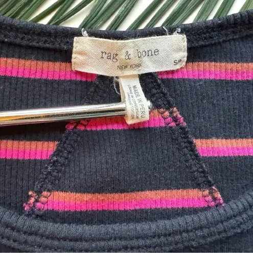 Classic and flattering Rag & Bone ribbed long sleeve top with pink and orange stripes against a dark... Show more