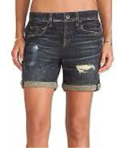 Chic dark blue jean shorts with a distressed finish. Rolled hem adds a stylish touch. Ideal for casu... Show more