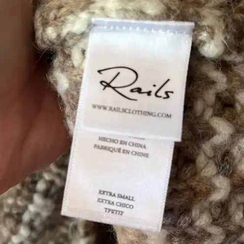 Rails Echo Chunky Roll Neck Pullover Sweater in Brown Striped Womens Size XS New with partial tag PRODUCT DETAILS Heavyweight, alpaca-wool blend, long sleeve, latte brown and creamy white space dyed mock neck sweater featuring stripe design, oversized fit, chunky knit design, dropped shoulder, and ribbed detail at neckline, hem, and cuffs. This classic, sophisticated style features an elevated textural fabrication that will keep you cozy and looking amazing. 60% Wool | 20% Alpaca | 20% Nylon. Imported. CARE Dry Clean. Cool Iron If Needed. Do Not Bleach. FIT TIP Fits true to size. MEASUREMENTS Length 22" Bust 25”