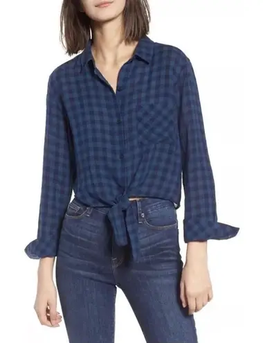 Rails Val Gingham Button Down in Indigo Coast Blue Black Large SO cute and in good preowned condition from Rails! Classic shirting in soft lightweight rayon. Tie-front blouse with single chest pocket. All measurements are provided in the photos to ensure best fit. Ships quickly in one day in super cute packaging from sunny California! Bundle to save, or submit an offer!