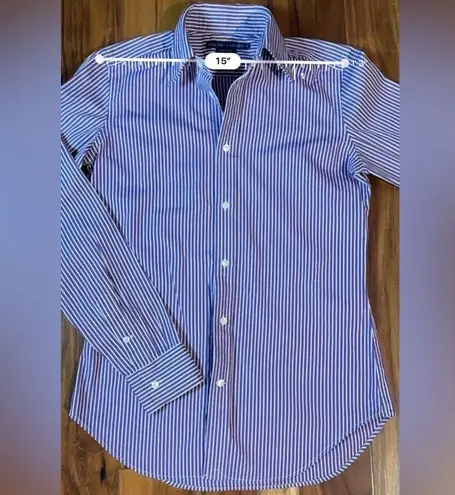 Ralph Lauren Classic Buttoned Down Shirt Slim fit Long Sleeves Purple and White Stripes 100% Cotton... Show more
