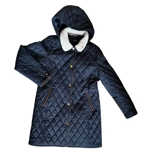 Diamond quilted navy jacket Zip off hoodie with Faux Sherpa collar Snap up Leather trimmed slash fro... Show more