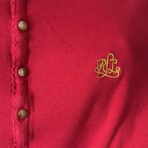 Cute red top with button accents. Features classic Ralph Lauren style. Gold embroidered monogram. Wa... Show more