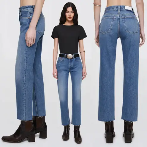 Re/Done High-Rise 70s Stove Pipe Jeans Retail $265 Size 26 Style 118-3wstv27 Wash: Medium Vain Excellent condition The 70s Stove Pipe in Medium Vain is our version of the classic 70s-inspired straight leg jean with cropped inseam. Features a worn indigo cast in rigid denim, a classic button fly, and a raw hem. * Fabric Description: Rigid - 100% Cotton Model Information: Model is size 25 and wearing a size 25. Specs: 11” high rise, 27” inseam, 14.5” leg opening Flat measurements Waist 14.25” Hip 19”