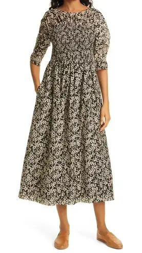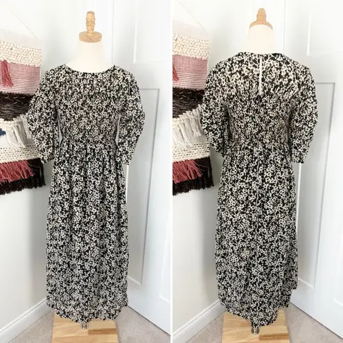 Rebecca Taylor Osaka Floral Midi Dress Size XS Color Cream/Black Condition Preloved/Excellent Short ruched sleeve Smocked bodice Pockets Back zipper closure Lined skirt Measurements flat, approx: Pit to pit 16“, Sleeve length 14“, Length 49“