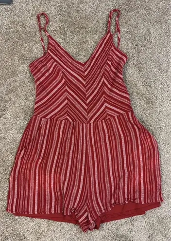 striped red romper with spaghetti straps! it also has pockets! only worn once for a fourth of july party! it says size small but it fits more like a medium! Perfect for July 4th or Memorial Day!