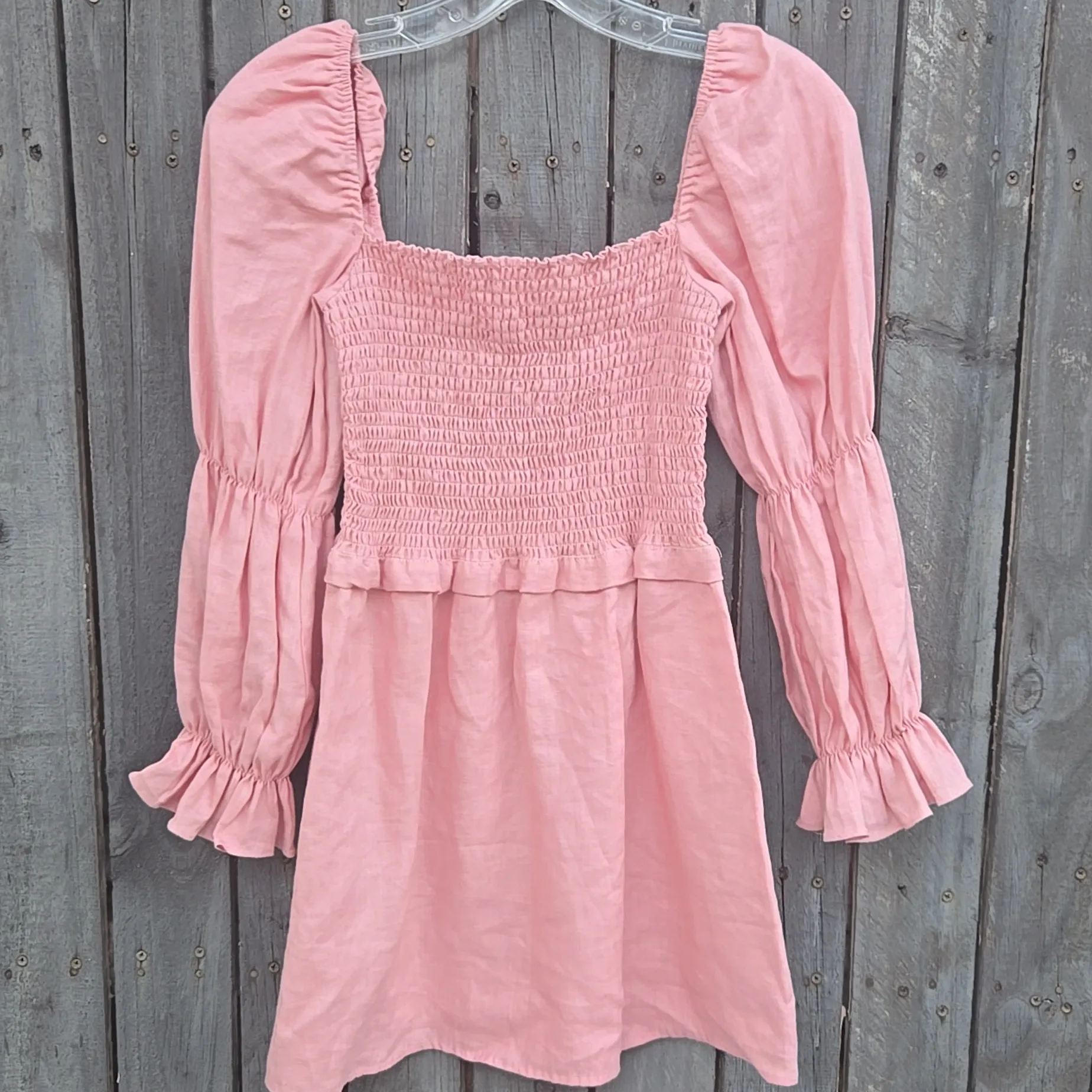 Chic blush dress with smocked bodice. Features long puff sleeves. Ideal for stylish outings.