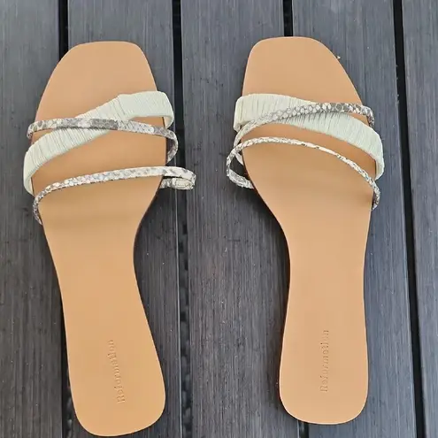 Elegant cream sandals with snake print straps. Perfect for versatile styling.