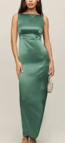 Keywords: Reformation silk maxi dress, green evening gown, quiet luxury, formal event dress, wedding guest dress, cocktail attire, elegant silhouette, open back dress, high neckline, fitted column fit, floor length dress, timeless style, romantic aesthetic, special occasion outfit, date night look, minimalist luxury, holiday party dress, elevated evening wear, chic formal look
