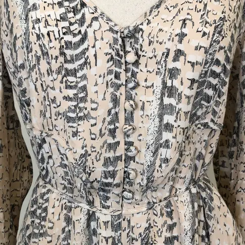 , size 4. Such a gorgeous dress!! It has a button up v neck front, tie waist, and buttons on the sleeves. There is a small spot on the front that looks like it should come out. The seam at the back is coming apart but it’s on the inside; it’s not visible from the outside. Chest (laying flat): 18 inches Waist: 17 inches Length: 36 inches Let me know if you have any questions. Make me an offer! No trades!