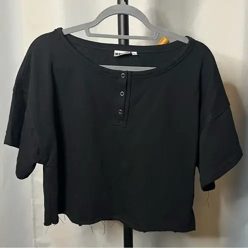 Revel Raw Hem Cropped Top. Black crop top that has a sweatshirt like material. Raw/distressed hemline. Snap buttons in the front. Size Small, slight oversized fit. *Measurements upon request if not already included. Offers always welcome and considered.* *Pet friendly, smoke free home. Everything is washed (unless NWT) and lint rolled before shipped.*