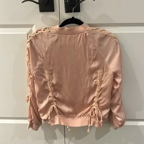 Super cute bomber jacket, has lace up on the sleeves and the back. Small tear on the inside but not... Show more