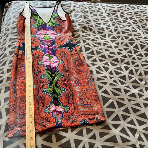 Revolve Clover Canyon Orchid Trip Neoprene Dress Sleeveless Mini Paisley Size S Step out in style with this Clover Canyon mini dress, featuring a striking pink, orange and green color palette. The sleeveless bodycon neoprene design and high neckline make it perfect for a night out or cocktail event. Its form-fitting silhouette and vibrant print ensure you'll turn heads wherever you go.