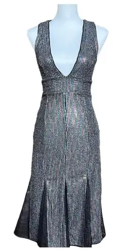 Allover sequin embellished fabric with a mesh hem and sides. Plunging v neckline and hidden back zip... Show more