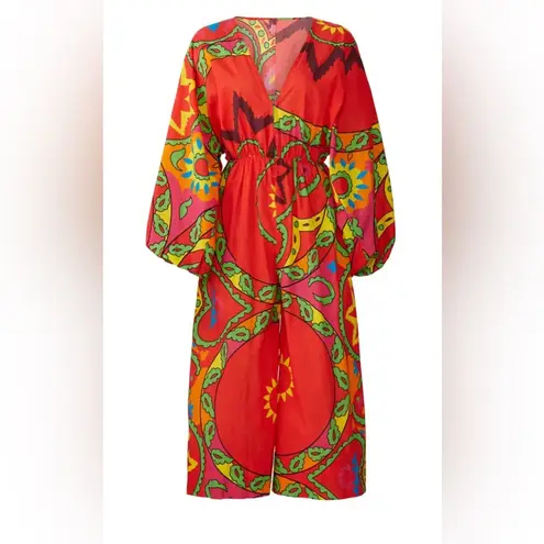 A vibrant medley of prints enliven this Rhode Resort jumpsuit that's a bright idea for sunny days and tropical getaways. Red and yellow cotton Jumpsuit. Long sleeves with elastic cuffs: balloon sleeves Elastic waistband V-neckline. Front hook and eye closure: can make it a deep V plunge or fasten closures for a more modest look Side pockets. 100% Cotton Approx measurements laying flat Pit to pit 20-21” dolman sleeves so hard to measure but should fit a variety of bust sizes due to hook & eye closures as well Waist 13.5” unstretched, stretches to at least 16.5” Rise 14” Inseam 23” Length 53" from shoulder to hemline Excellent used condition Freshly laundered Smoke free home