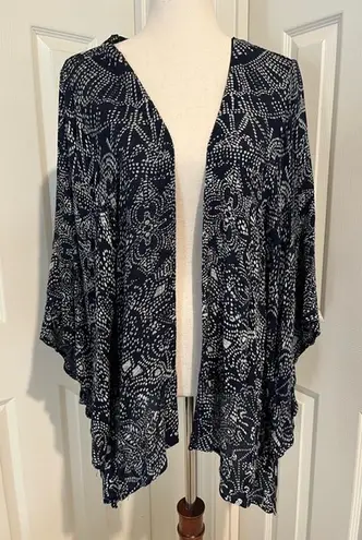 Stylish navy and white kimono with intricate patterns. Perfect for layering.