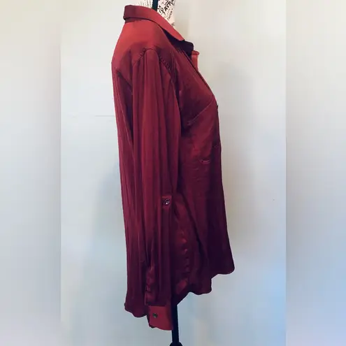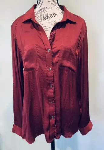 Pre-owned in excellent condition. The button placket is glitter encrusted. Flowy blouse with roll ta... Show more