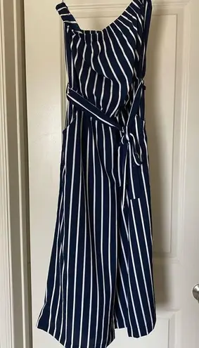 Navy blue strapless jumpsuit Never worn!!! Perfect Condition! Has pockets!!! Cute removable tie ar... Show more