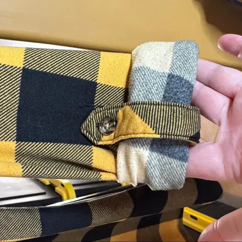 Rue21, buffalo plaid, mustard yellow, black check, button down shirt, flannel style, soft shirt, cozy top, XS, fall fashion, warm shirt, long sleeve, roll tab sleeve, casual wear, checkered shirt, layering piece, trendy plaid, comfy, cabin style, outdoorsy look, streetwear plaid, everyday top, women’s shirt, fall wardrobe