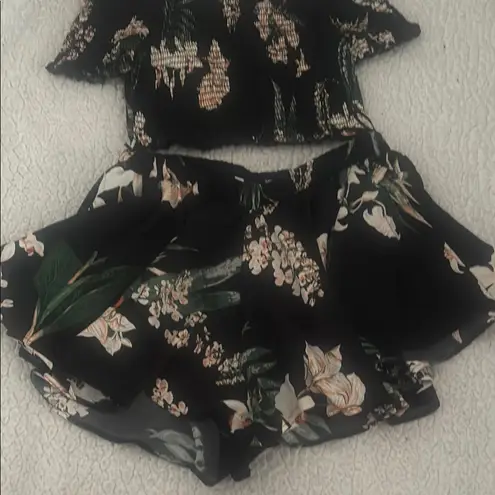Stylish black floral off-shoulder top with matching shorts. Perfect for a chic look.