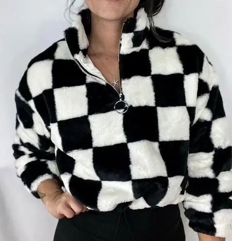 Salty Savage checkered fluffy faux fur quarter zip pullover size small oversized Black - $51 - From SheSaid