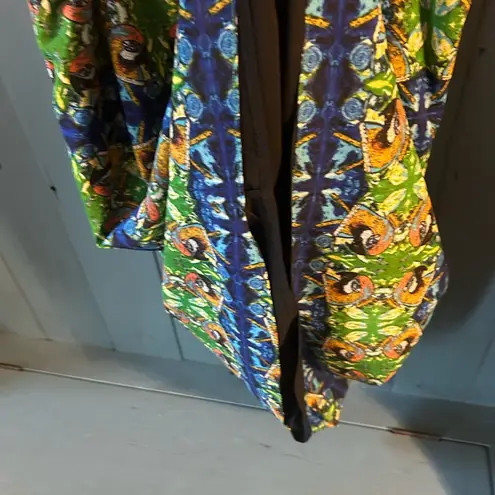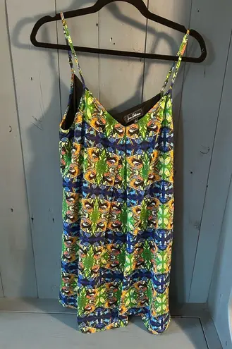 Vibrant dress with a colorful tropical parrot pattern. Features shades of blue, green, and yellow. L... Show more