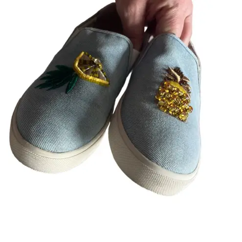 Stylish denim slip-on shoes. Features pineapple and lemon beaded embroidery. Casual slip on sneaker... Show more