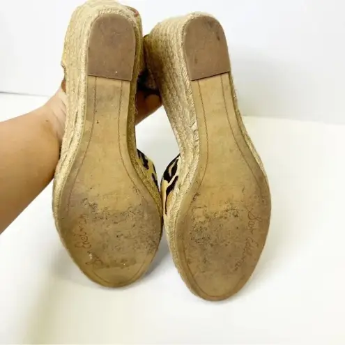 Black and tan leopard print calf hair espadrille wedges with peep toe heel. Ankle strap closure. *... Show more