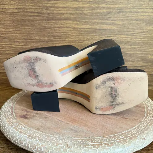 An inverted, stacked heel wrapped in snakeskin-embossed leather elevates this bold sandal featuring... Show more