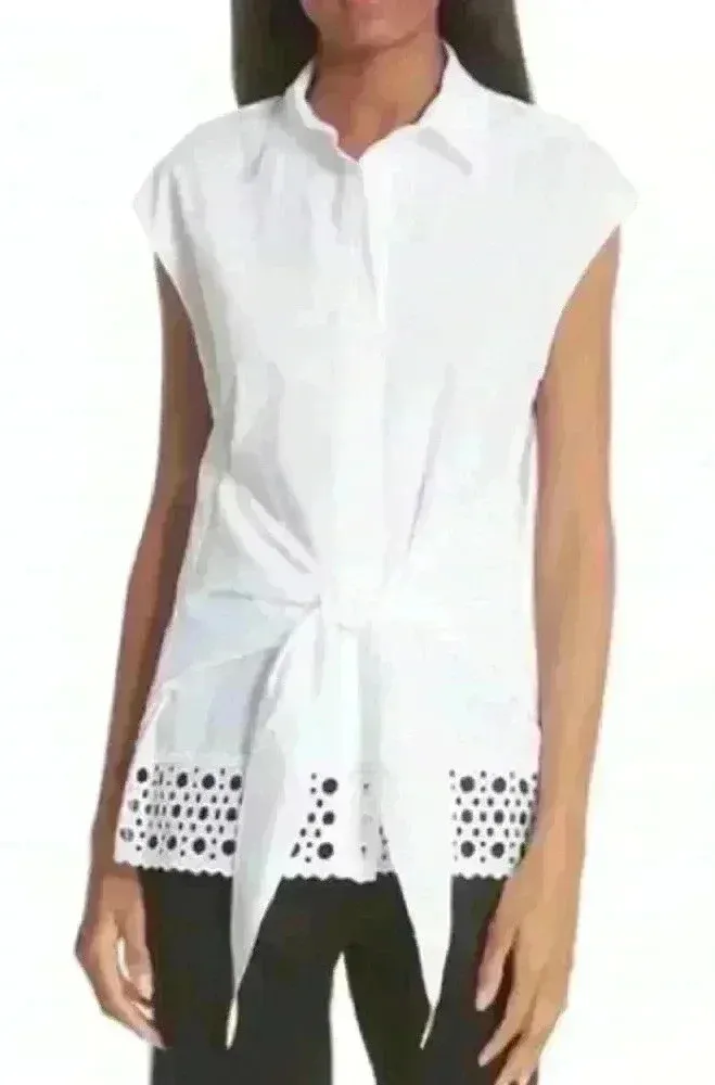 SANDRO Eyelet Trim Tie Front 100% Cotton White Blouse In Ecru. Size /. Excellent pre-owned condition. • Designed for a slim fit • Spread collar, cap sleeves • Front button closures, self-tie front • Scalloped eyelet hem, back yoke