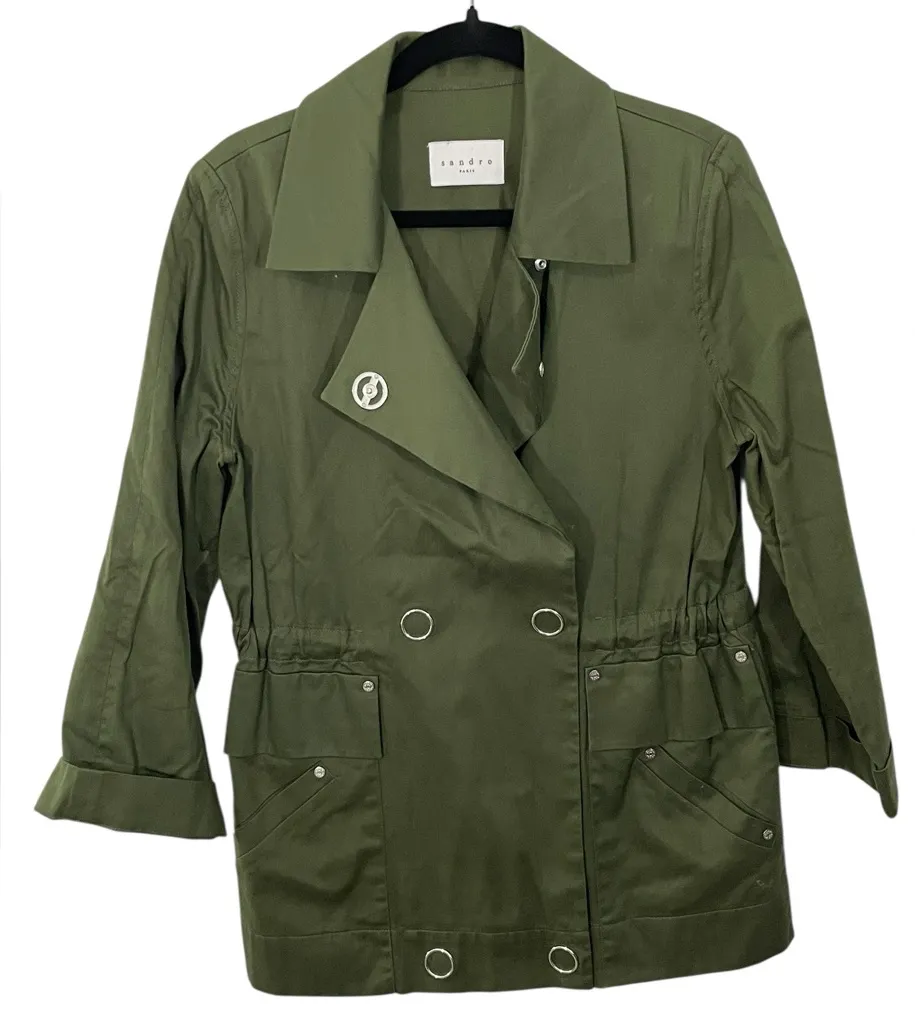 Sandro Paris Olive Green Utility Double Breasted Jacket Women’s Size EU 38 in excellent condition Approx measurements: Length 29.75” Pit to pit 20.25” 100% Cotton Chic and versatile Sandro Paris jacket in olive green. Designed with a double-breasted snap front, oversized lapel collar, cinched adjustable waist, and utilitarian grommet details. Features multiple front flap and patch pockets with snap closures and 3/4 sleeves with turn-up cuffs. A Parisian-inspired piece that balances military style with modern sophistication. Perfect for layering through multiple seasons. Tags- Sandro Paris, Sandro jacket, Sandro Paris jacket, women’s utility jacket, women’s military jacket, olive green jacket, green trench jacket, designer outerwear, French fashion, Parisian chic, double breasted jacket, cinched waist jacket, Sandro coat, casual layering piece, lightweight jacket, street style jacket, modern trench, fashion outerwear, spring jacket, fall jacket