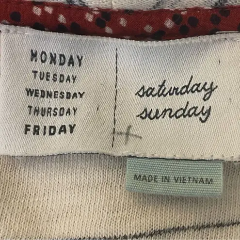 This cardigan from Saturday Sunday is made from fabric that feels like a soft, medium weight sweatshirt. -Cream color with slate blue and grey stripes, thin and thick as well as some red accents -Open-styling -Drapes beautifully -2 front, buttoned pockets -Plenty of stretch Pit to pit-20” Width at hem-23” Length-25”-back and 29”-longest (Measurements appx.- Flat Lay)
