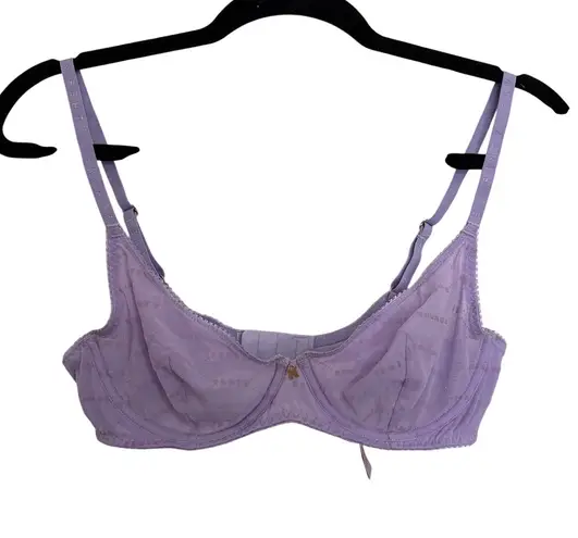 Savage X Fenty Flocked Logo Unlined Demi Bra in Purple Lavender with repeating logo pattern and heart dot detailing. Features Xclusive flocked logo fabric, rose gold tone X charm at center front, underwire demi cups, U-back design with powermesh wings, and adjustable logo straps. Fabric is 94% Nylon, 6% Spandex with rose gold tone hardware and satin bow at center front. Good pre-owned condition.