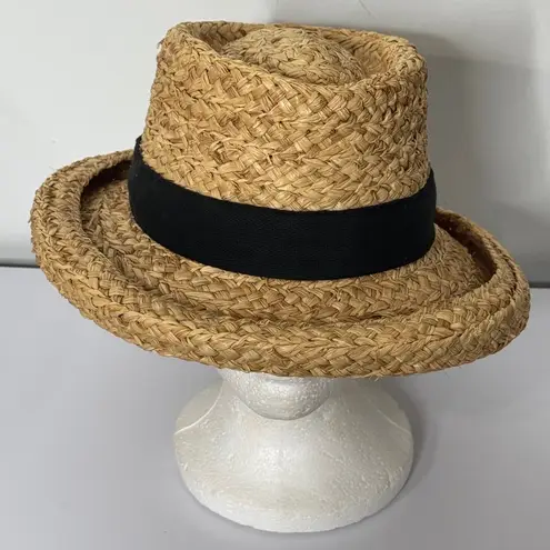 . Rough braid Raffia hat. Slightly tapered crow with depressed crown top. Herringbone ribbon band wi... Show more