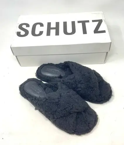 Brand new in box Schutz Dynora Flat Slide in Black Stay cozy-chic 24/7 in these crisscross slides. Made from faux shearling, this relaxed style will keep your at-home looks feeling refined. Material: Faux Shearling Heel Height: 0.4 in